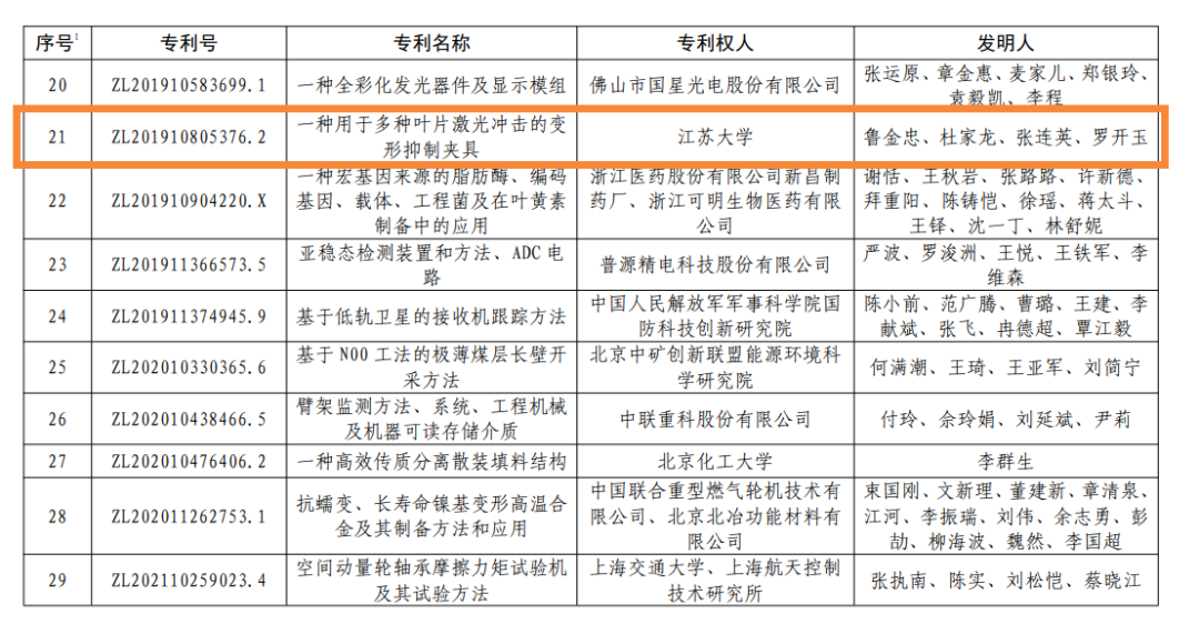 近日,国家知识产权局发布第二十四届中国专利奖授奖决定,江南平台客服专利“一种用于多种叶片激光冲击的变形抑制夹具”(专利号ZL201910805376.2)喜获中国专利金奖。此次共有83所高校获得中国专利奖,获金奖的高校仅有5所,其中西安交通大学有2个项目获得金奖,浙江大学、上海交通大学、北京化工大学和江南平台客服各有1项金奖。