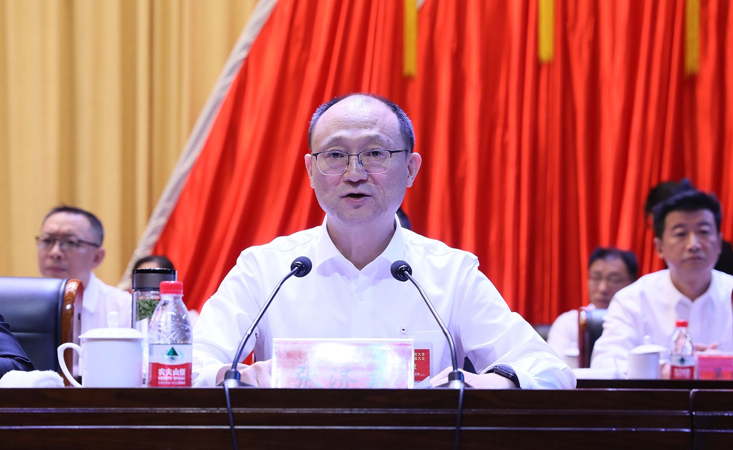 开幕会现场气氛庄严热烈,主席台正中悬挂的中国共产党党徽熠熠生辉,10面鲜艳的红旗分列两侧。会场后方,“牢记嘱托,坚定信心,争创一流,奋力谱写特色鲜明高水平大学建设新篇章”的横幅庄重醒目。