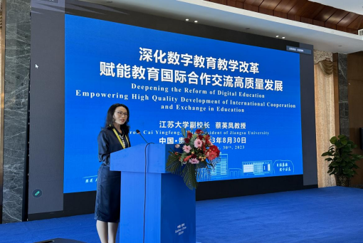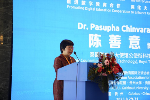 作为论坛的重要组成部分,在中泰大学校长论坛上,蔡英凤、蓬猜·蒙空瓦尼、张建华、宋塔温、潘查妮·高娜、贵州师范学院副校长任洁等积极探索智慧教育新模式,围绕“推进数字教育合作,深化大学互联互通”主题进行了深入交流,进一步深刻认识教育数字化的重要战略意义,拓宽中泰两国教育交流合作渠道,以期更好地服务两国高等教育合作需求、推进国际高等教育合作的理念与实践创新。报告中,蔡英凤围绕数字教育国际合作交流面临的新形势、数字教育赋能教育国际化的江大实践以及深化数字教育国际合作的构想与建议,介绍了我校在数字教育赋能国际合作与交流高质量发展方面的经验与实践。