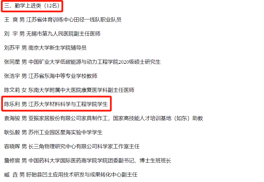 陈乐利入选江苏省“我们身边的好青年”,充分展示了我校学子良好的精神风貌,有助于更好地引领江大学子争做信念坚定的奋进者、勤学善思的好学者、笃行不怠的担当者、崇德向善的奉献者,用青春热血奏响“请党放心、强国有我”的时代强音。(团委 材料学院)