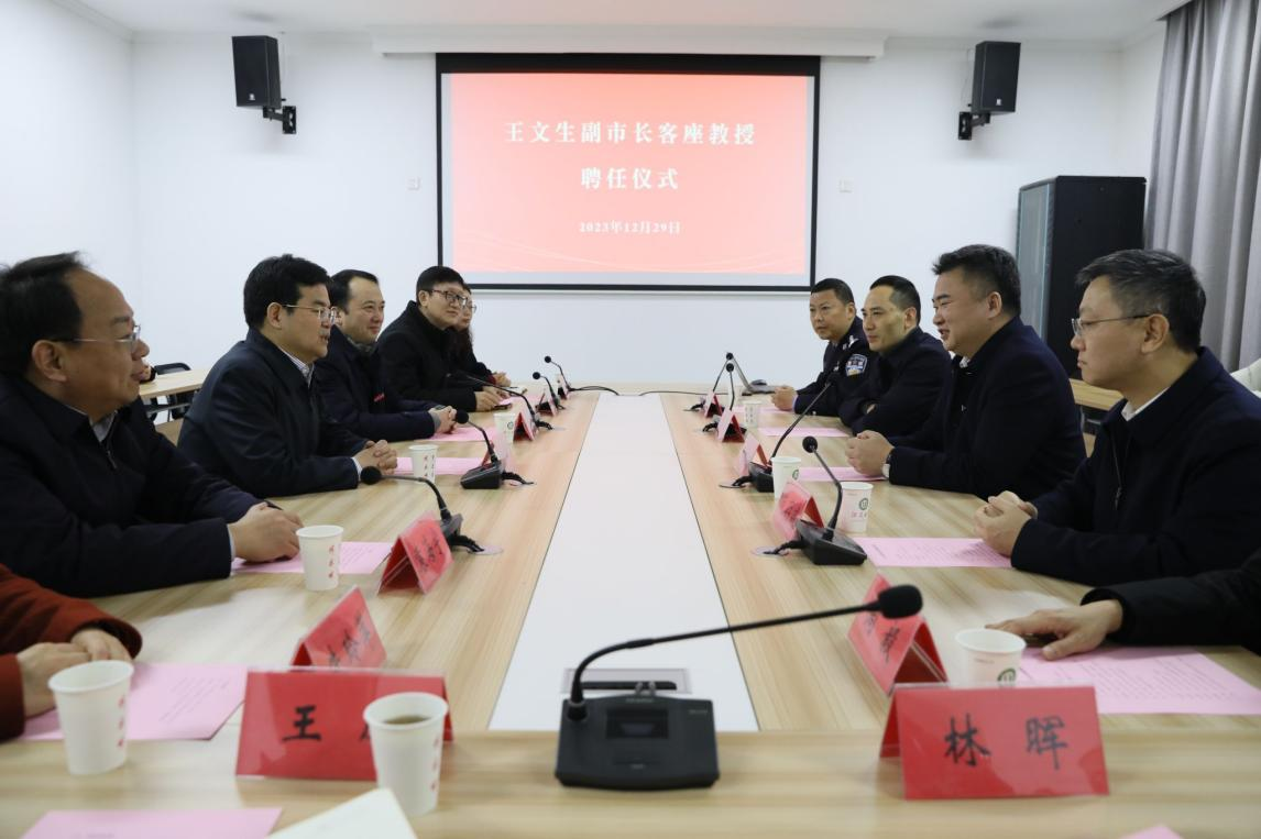 王文生客座教授聘任仪式在一站式服务中心会议室举行。李洪波为王文生颁授了江南平台客服客座教授聘书并佩戴江南平台客服校徽。他向镇江市公安局一直以来对我校安全稳定工作的支持与关心表示感谢,希望进一步加强警校合作,助力我校法治人才培养质量提升。