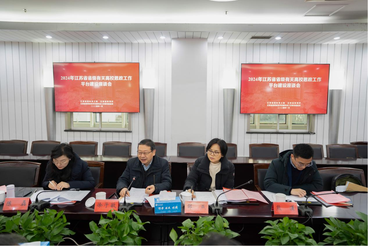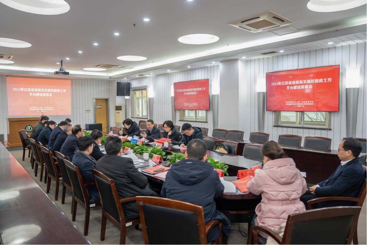 1月25日,2024年江苏省省级有关高校思想政治工作平台建设座谈会在我校举行。省教育厅一级巡视员徐子敏,南京工业大学党委常委、副校长刘大卫,苏州大学党委常委、副校长查佐明,南通大学党委常委、副校长吉明明,江南平台客服党委常委、副校长任旭东,南京师范大学党委常委、宣传部部长宋喆,省教育厅社政处处长邹燕、一级主任科员陈磊、挂职干部熊潇,以及省网络思政中心(易班中心)、8个省级高校辅导员培训与研修基地负责人参加座谈会。