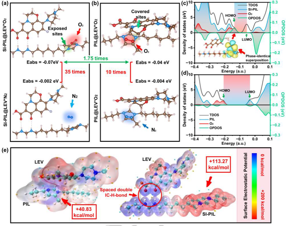 由SI-PIL-TiO2表面的亚氨基团和LEV的羰基基团形成的IC-H-bond对空气中O2的还原具有独特优势。首先,它能将咪唑活性位点的从被覆盖状态转换为完全暴露状态,以屏蔽电子供体的无序吸附和空气中氮气对活性位点的抢占。其次,IC-H-bond使得咪唑活性位点形成了更强的正电势和更亲和力的O2轨道结合模式,这为选择性化学吸附O2建立一种独特的具有竞争力的咪唑活性位点。最终,具有IC-H-bond作用的光催化体系在空气中实现了1518µmol/g/h的H2O2产率,且达到了94.8%的总O2利用率和转化效率,是没有隔位双氢键的光催化体系的16倍。