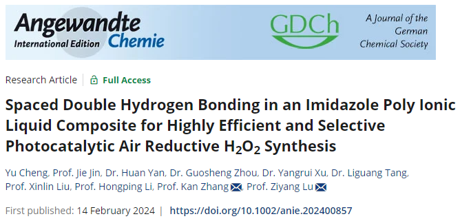 近日,我校最新研究论文“Spaced Double Hydrogen Bonding in an Imidazole Poly Ionic Liquid Composite for Highly Efficient and Selective Photocatalytic Air Reductive H2O2 Synthesis”在《德国应用化学》(Angewandte Chemie-International Edition )(IF:16.6)上在线发表。江南平台客服为第一完成单位,环境与安全工程学院硕士研究生程煜、教师金杰为共同第一作者,教师逯子扬为通讯作者。