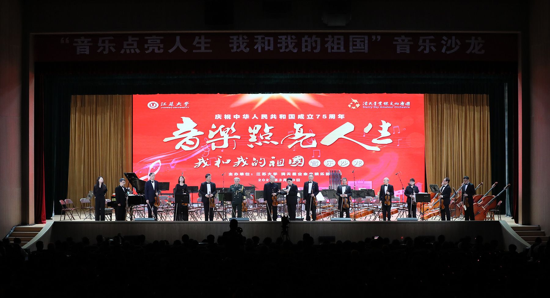 3月30日晚,满天星业余交响乐团应邀走进我校,在学校大礼堂举办“音乐点亮人生 我和我的祖国”专场音乐沙龙,为全校师生带来了一场高雅艺术视听盛宴。校党委书记李洪波、镇江市副市长武鸣会见了乐团主要成员。校长邢卫红,校党委副书记张济建,校党委常委、宣传部部长、统战部部长吴麟麟,以及现场师生1400 余人共同聆听经典名曲,感受高雅艺术魅力。