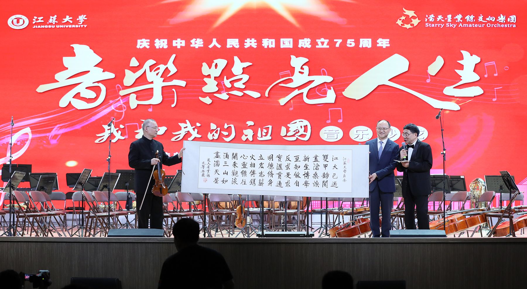 陈燕民代表满天星业余交响乐团向我校师生赠诗,张济建代表学校接受赠予。