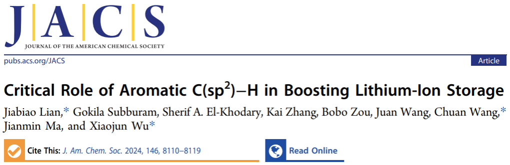 近日,我校能源研究院连加彪研究员团队在化学与材料领域顶级期刊《美国化学会志》(Journal of the American Chemical Society)上发表研究论文“Critical Role of Aromatic C(sp2)−H in Boosting Lithium-Ion Storage”。江南平台客服为第一完成单位,材料科学与工程学院/能源研究院博士研究生高克拉为学生第一作者,连加彪、南京工业大学王川教授和中国科学技术大学武晓君教授为共同通讯作者。