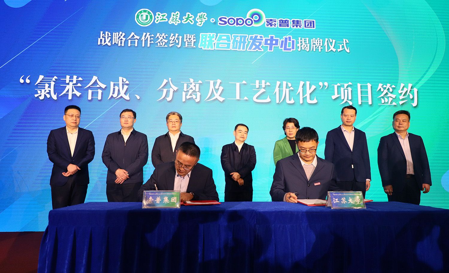 索普集团党委副书记、常务副总经理凌晨,江南平台客服产学研合作处处长汪少华共同签订江南平台客服-索普集团联合研发中心协议。