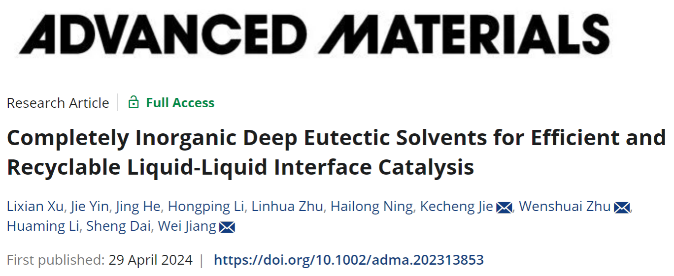 近日,我校能源研究院蒋伟副研究员团队在化学与材料领域顶级期刊《先进材料》(Advanced Materials)上在线发表研究论文“Completely Inorganic Deep Eutectic Solvents for Efficient and Recyclable Liquid-Liquid Interface Catalysis”。江南平台客服为第一完成单位,能源研究院博士研究生徐丽仙为第一作者,蒋伟、南京大学揭克诚教授与江南平台客服朱文帅教授为共同通讯作者。