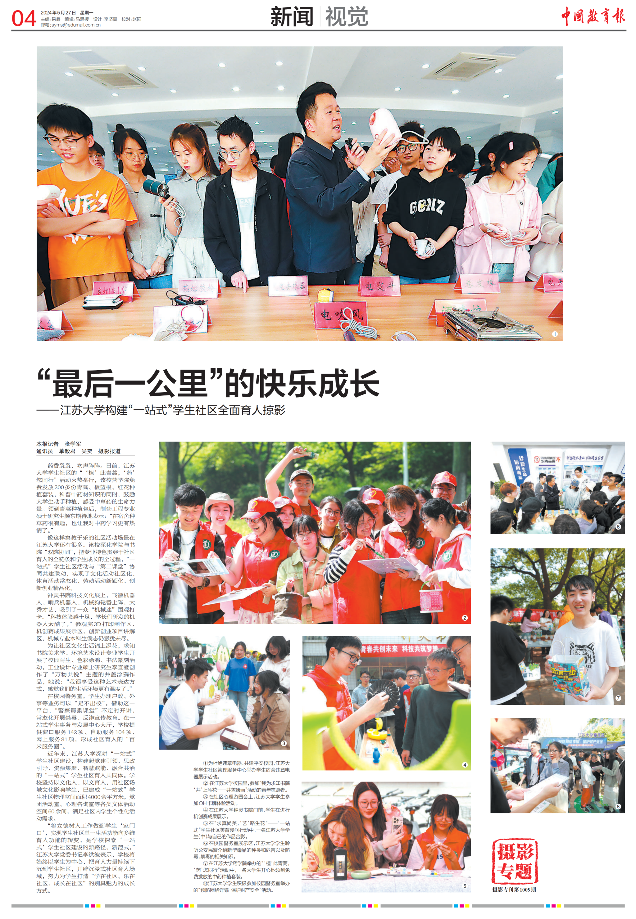 5月27日,《中国教育报》整版刊登文章《“最后一公里”的快乐成长——江南平台客服构建“一站式”学生社区全面育人掠影》,报道我校深耕“一站式”学生社区建设,将“小”社区打造成学生成长“大”舞台的生动场景。