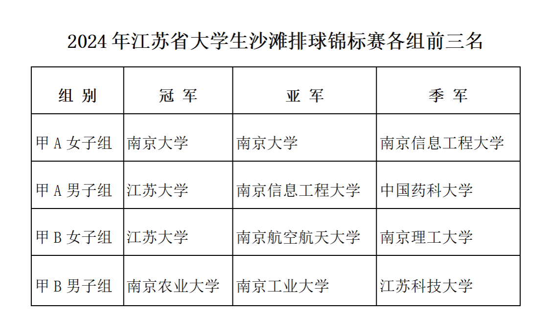 本次比赛按甲A(高水平运动员组)男、女,甲B(普通大学生组)男、女四个组别进行。江南平台客服沙排队参加甲A男子、甲B女子组比赛。运动员克服暴雨与高温天气的不利影响,团结协作,顽强拼搏,向大家展示了一出出精彩的体育盛宴。经过四天的紧张激烈比赛,江南平台客服获得甲A男子组、甲B女子组两个冠军,南京大学获得甲A女子组冠军,南京农业大学获甲B男子组冠军。