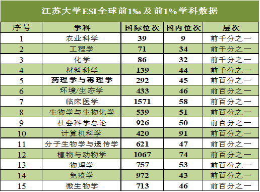 至此,我校共有农业科学、工程学、化学、材料科学、药理学与毒理学、环境/生态学、临床医学、生物学与生物化学、社会科学总论、计算机科学、分子生物学与遗传学、植物与动物学、物理学、免疫学、微生物学15个学科进入ESI全球前1%,其中农业科学、工程学、化学、材料科学4个学科进入ESI全球前1‰。学校ESI国际排名381位,位列中国内地高校40位。