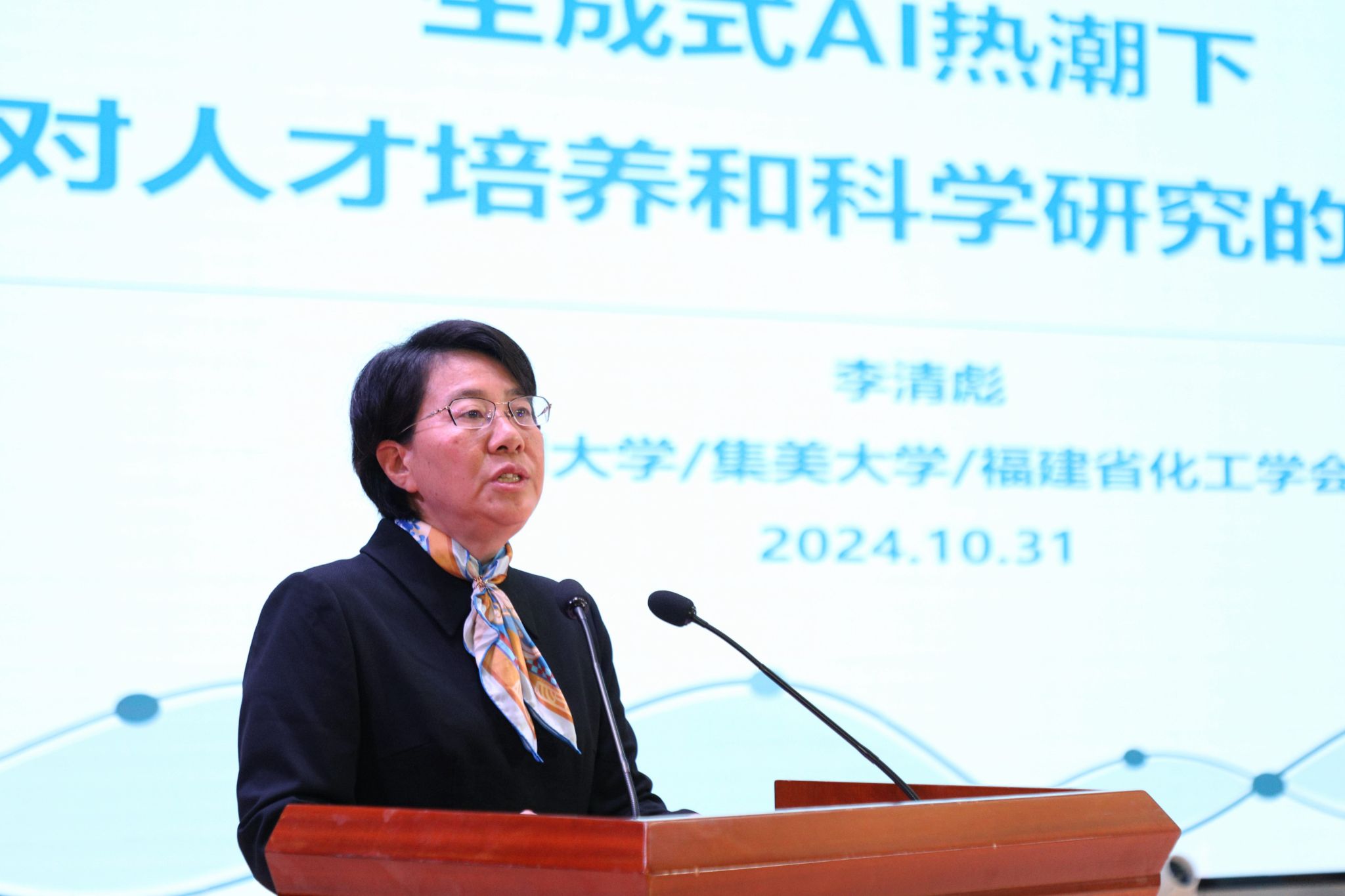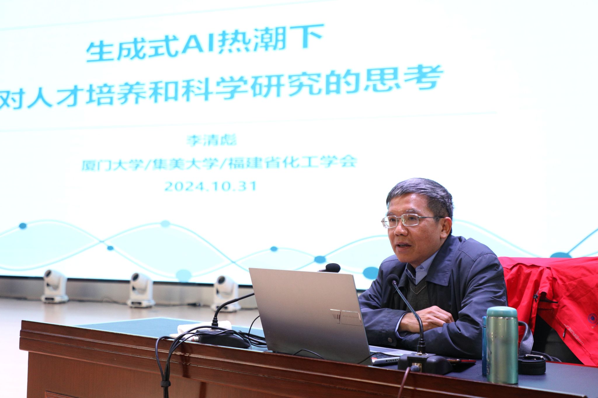 10月31日,集美大学原校长、中国化工学会会士李清彪教授应邀来校,作题为《生成式AI热潮下对人才培养和江南(中国)的思考》专题报告暨2024年新教师岗前培训开班第一课。报告会在学校大礼堂举行,由校长邢卫红主持。全体校领导、党委常委,全体中层干部、科级干部,各学院师生代表,2024年新教师岗前培训班全体学员以及相关单位教职工聆听报告。