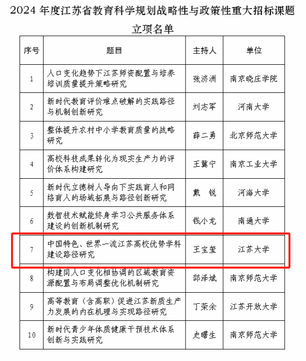 近日,江苏省教育科学规划领导小组办公室发布2024年度江苏省教育科学规划战略性与政策性重大招标课题立项名单,共立项10项,我校教师教育学院教授王宝玺申报的《中国特色、世界一流江苏高校优势学科建设路径研究》获批立项。