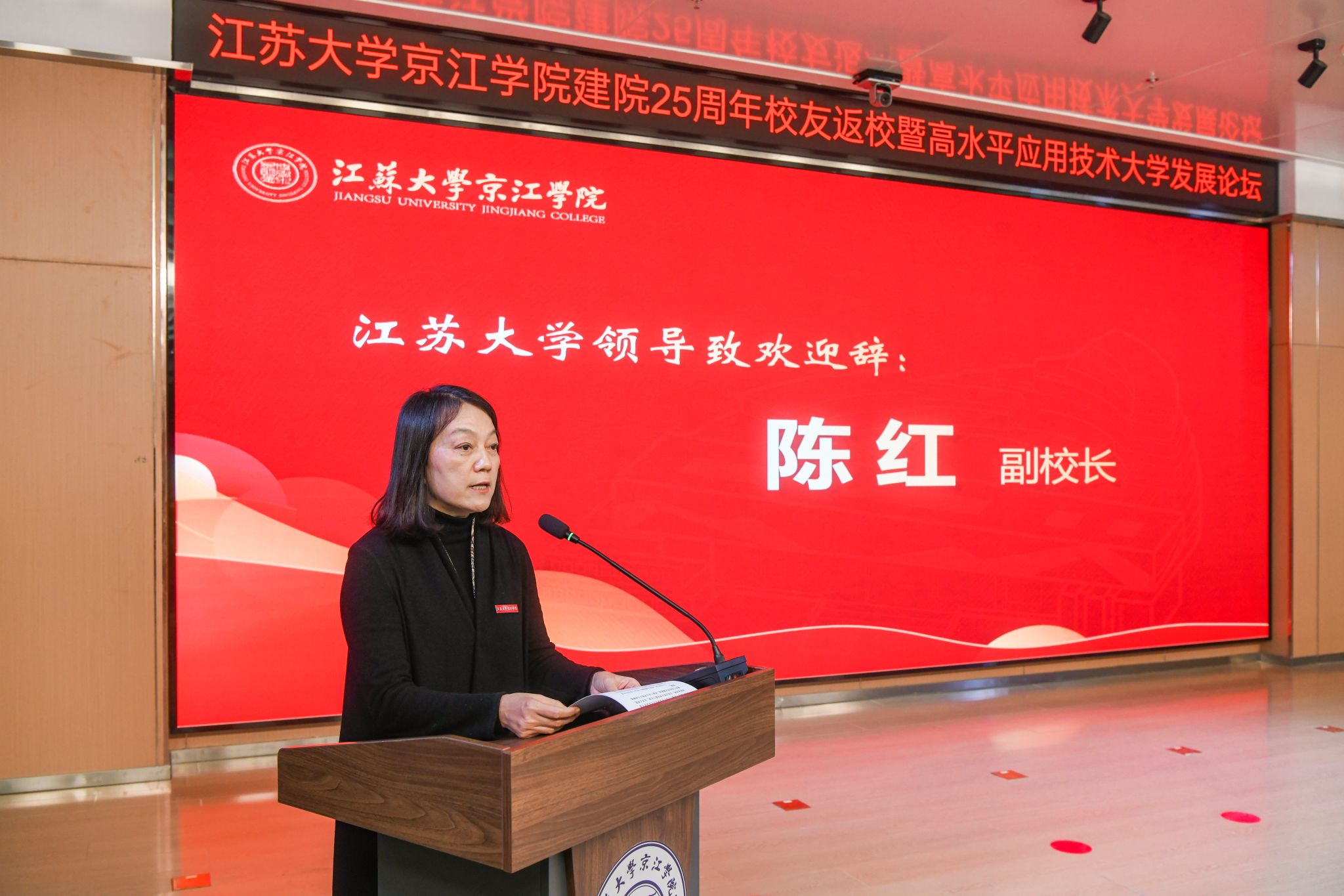陈红致欢迎辞,她代表江南平台客服向各位领导、各位嘉宾表示欢迎,向全体师生员工、广大校友致以问候,向关心支持京江学院发展的各级领导、各界朋友、兄弟高校表示感谢。陈红表示,25年来,京江学院紧紧依托母体江南平台客服,事业发展呈现新面貌,高质量发展迈出新步伐。她希望全体师生同心协力,继续为实现高水平应用技术大学目标砥砺前行,为区域经济社会发展作出新的贡献。