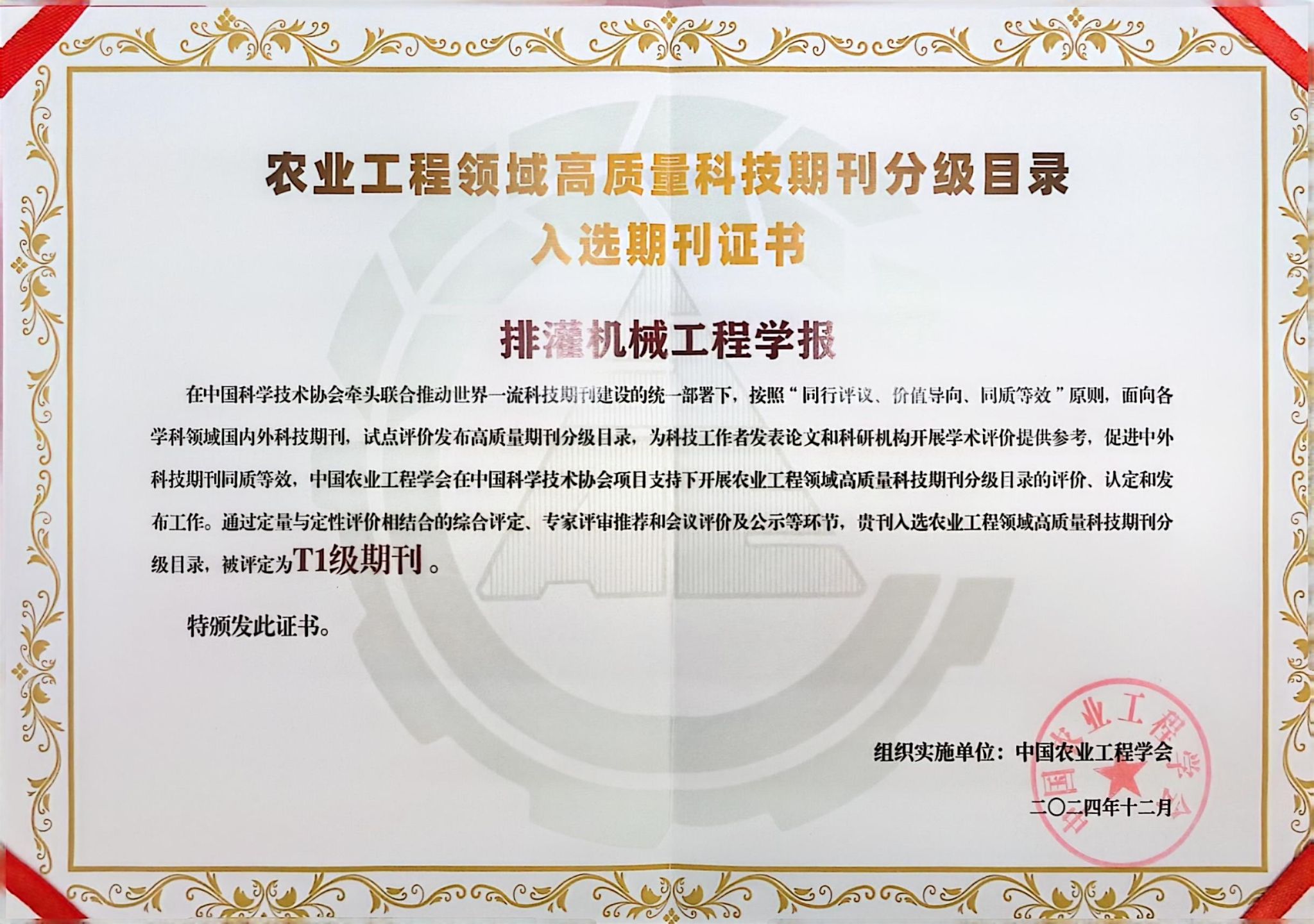 近日,中国农业工程学会在中国农业科学院国家农业图书馆召开发布会,正式发布其编制的“农业工程领域高质量科技期刊分级目录”,我校主办的《排灌机械工程学报》《江南平台客服学报(自然科学版)》双双入选,分别位列T1级和T2级。