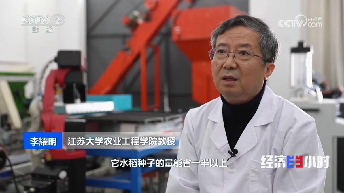 水稻种植人工育秧费时费力、效率低,传统机械式育秧播种易损伤稻种胚芽,影响生长且种子浪费严重。李耀明教授团队的创新成果破解了水稻播种的难题。从1996年开始,李耀明团队尝试利用气体吸附原理进行水稻的精密化育秧播种研究。由吸尘器的气体吸附原理,李耀明想到了用空压机产生气体,吸尘器吸头变成吸盘的方式,来吸附水稻种子。在不伤种的前提下,完成水稻育秧播种到摆盘的工作。经过上千次的反复试验,李耀明团队慢慢掌握了稻谷吸附和振动之间的规律,水稻育秧播种机吸附率从最初的30%提升到90%以上。过去机械式播种的一张穴盘需要播150克种子,而气吸式播种最少只需要播25克种子。“它的水稻种子的量能省一半以上杂交稻差不多能省到50块钱一亩地产量能够增加8%到10%”李耀明介绍,每亩能够增产100斤到150斤单产非常可观。