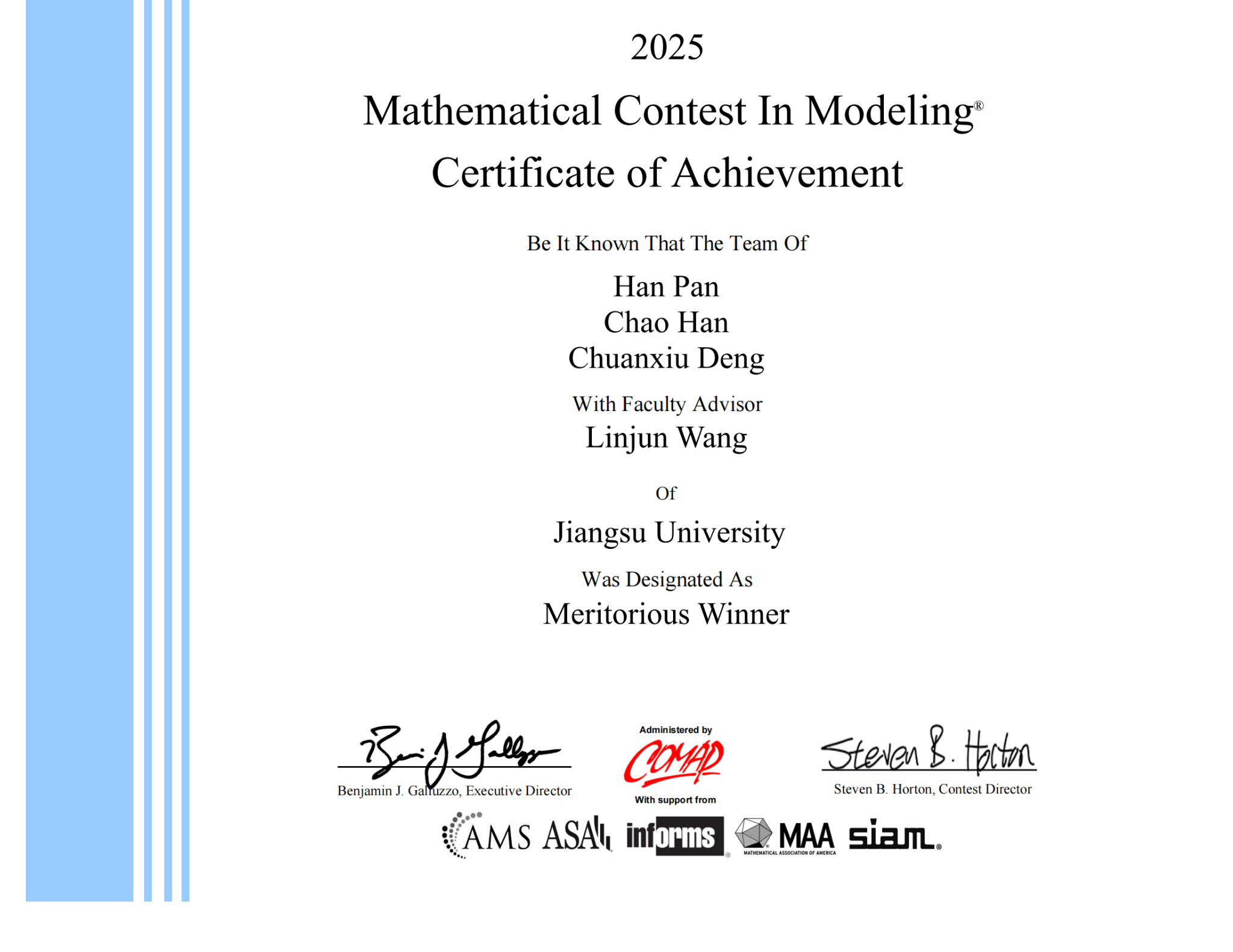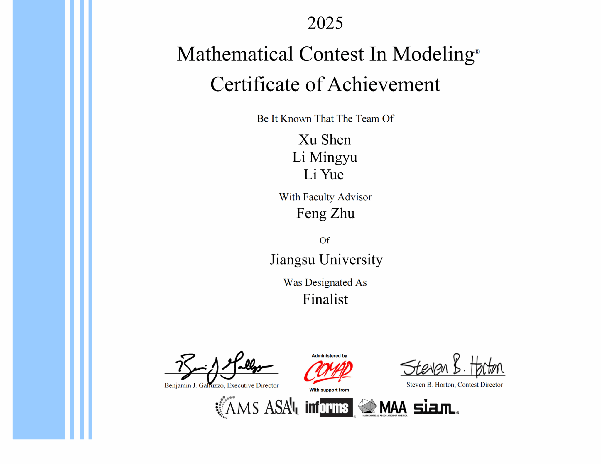 近日,2025年美国大学生数学建模竞赛成绩揭晓,梦溪学院学生获得特等奖提名奖(F奖)一项、一等奖(M奖)一项、二等奖(H奖)一项、三等奖(S奖)两项。