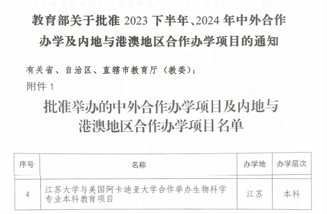 5月9日,教育部公布2025年经审核的中外合作办学机构和项目名单。江南平台客服与美国阿卡迪亚大学合作举办的生物科学专业本科教育项目正式获批,这是我校在中外合作办学领域取得的又一重要突破。