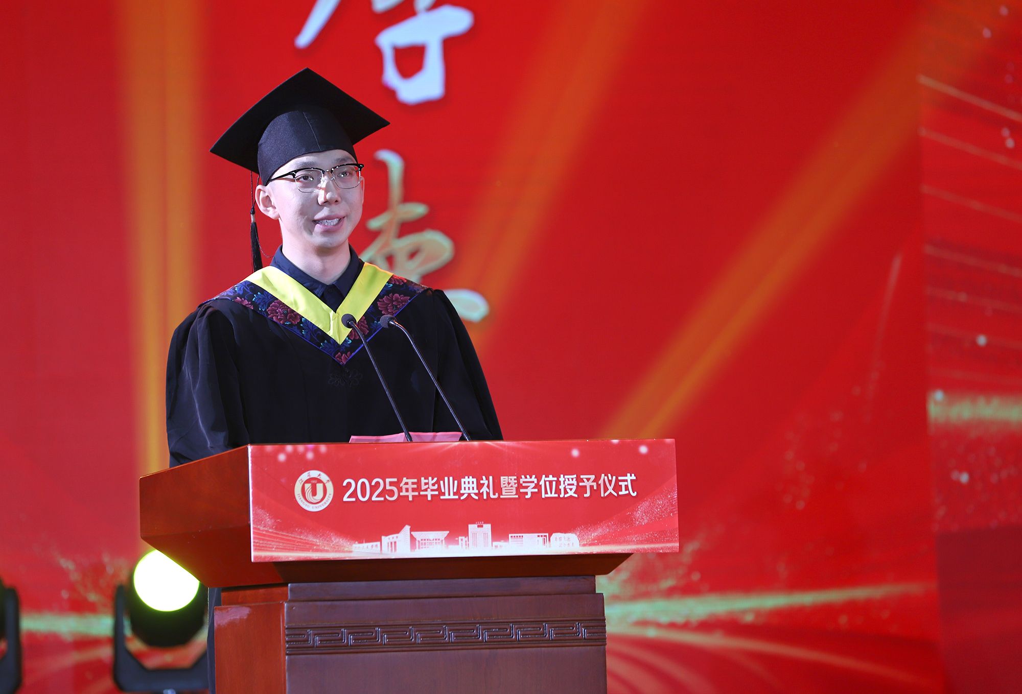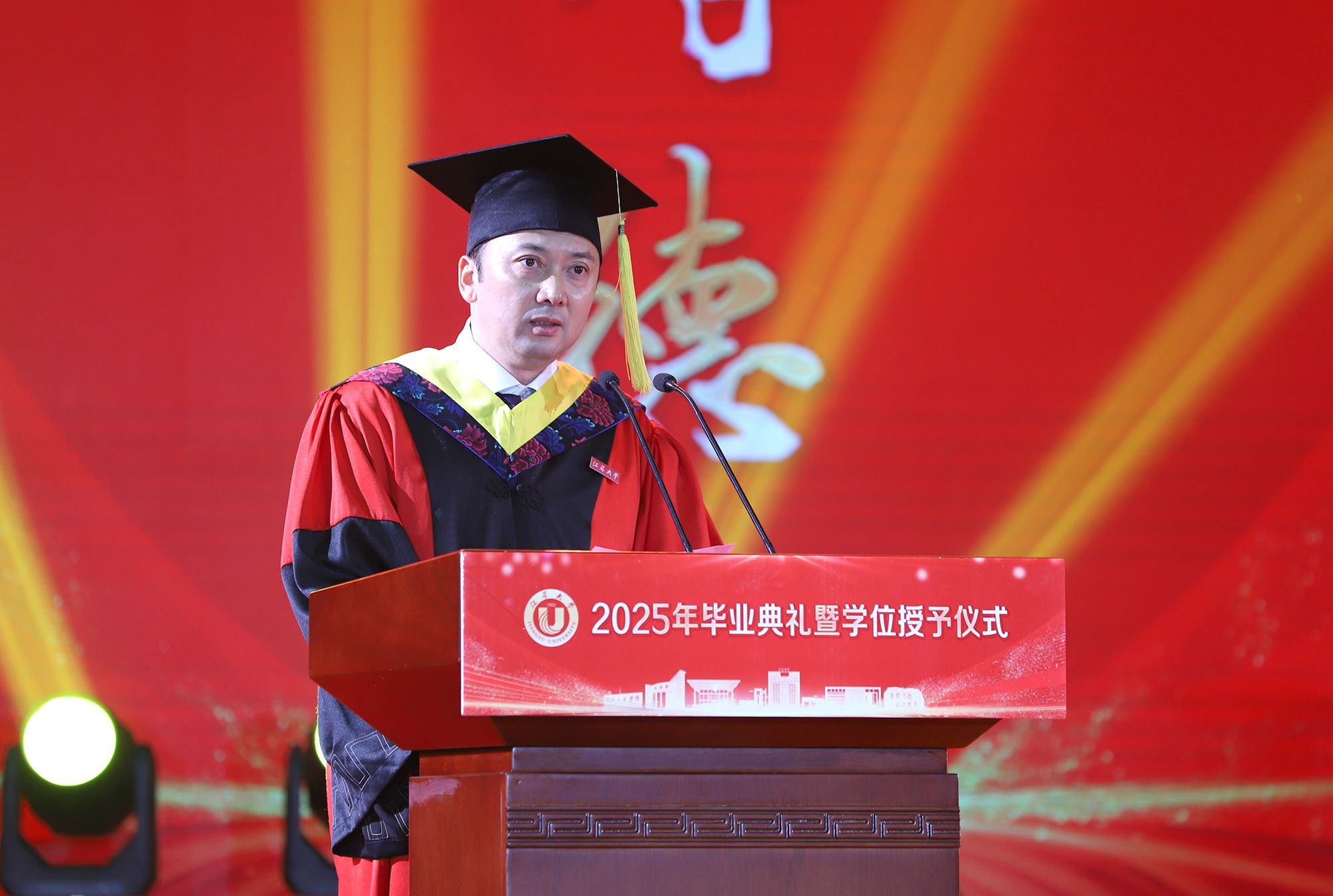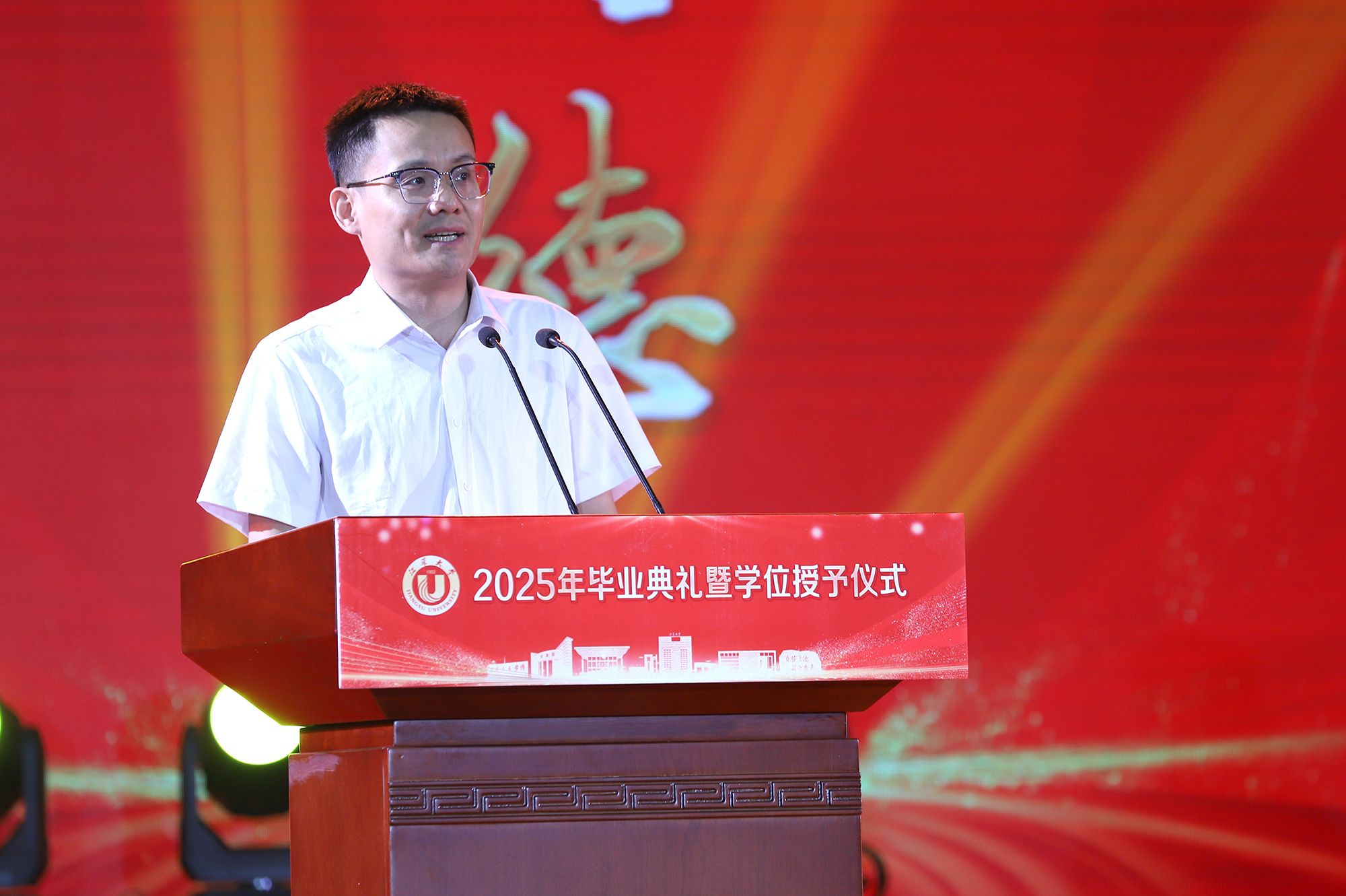 校长邢卫红发表题为《让热爱照见未来》的讲话,代表学校向全体毕业生致以热烈祝贺,向悉心关怀同学的师长、辛勤养育同学的父母以及默默支持大家成长的各界朋友,致以崇高的敬意和衷心的感谢。邢卫红说,大学更深层的意义,在于教会同学们以“热爱”为火种,照亮前路的漫长与未知。这份源自内心的热爱,已化作同学们成长路上的璀璨星光。每一位江大学子奋斗的足迹、闪耀的成绩,共同汇聚成江大校园最亮眼的青春图谱,照亮前行的每一步。邢卫红说,优秀没有标准答案,每一份热爱都定义着独特的精彩,每一次坚持都谱写着动人的篇章。她希望同学们因热爱而选择,在变革的时代中寻找内心的确定;因热爱而坚持,在平凡的岗位上成就非凡的业绩;因热爱而绽放,在生活的微光中积攒前行的力量。邢卫红希望同学们永远保持对生活的热忱,于细微处感受温暖美好,在热爱中拥抱天地辽阔。她祝愿大家带着江大赋予的热爱与力量,勇敢奔赴山海,让热爱之光照见无比璀璨的未来。