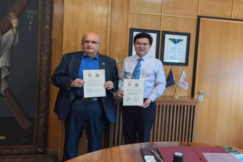 6月23日,代表团首站访问希腊帕特雷大学(University of Patras),与校长克里斯托斯•布拉斯(Christos Bouras)、学术与国际事务副校长迪奥尼修斯•曼察维诺斯(Dionissios Mantzavinos)举行会谈。双方正式签署合作意向书,致力于创建“一带一路”智慧农业技术与装备国际联合实验室,同步启动学生互换交流与境外办学项目,标志着中希高校合作迈入深度融合新阶段。当日,代表团还拜访了历史悠久的希腊雅典科学院,美国国家工程院院士、希腊科学院院士、希腊雅典国立技术大学化学工程教授Doros Nicolas Theodorou等热情接待。双方就开拓科技合作渠道、促进江南平台客服与希腊雅典科学院开展技术交流、高层次人才引进与输出达成共识。