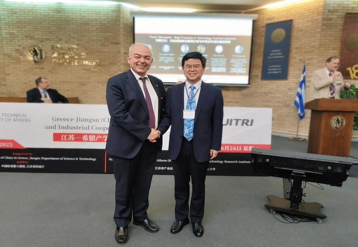 6月24日,代表团在希腊雅典国立技术大学参加“江苏—希腊产学研合作交流会”。江苏省委书记信长星、希腊阿提卡省省长尼科斯·哈扎利亚斯(Nikos Hardalias)、中国驻希腊大使方遒等出席会议,来自两国政府、高校、科研机构和企业的160余位代表参会。会议聚焦人工智能、绿色能源、海洋工程等前沿领域,深入探讨中希在科技创新与成果转化方面的合作潜力,积极拓展双方产学研融合发展的新路径。李洪波一行与雅典国立技术大学校长IOANNIS K. CHATJIGEORGIOU、校董事会理事Sergios Theodoridis对接“一带一路”智慧农业技术与装备相关合作,向希腊高新技术园区、高校院所及科技企业推介江南平台客服技术成果,推动务实对接。代表团还与中国驻希腊大使馆教育参赞王瑾、亚里士多德大学代表TZOUVELEKAS MANOLIS对接了技术转移、学生流动项目合作。