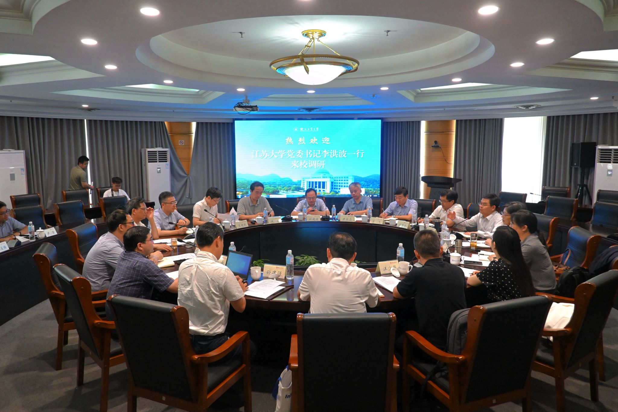 在浙江工业大学,党委书记蔡袁强、副校长胡军接待了李洪波一行。蔡袁强介绍了浙江工业大学的办学情况以及学校有组织地做有用的科研,构建“立地顶天”的科技创新体系等方面的改革举措。