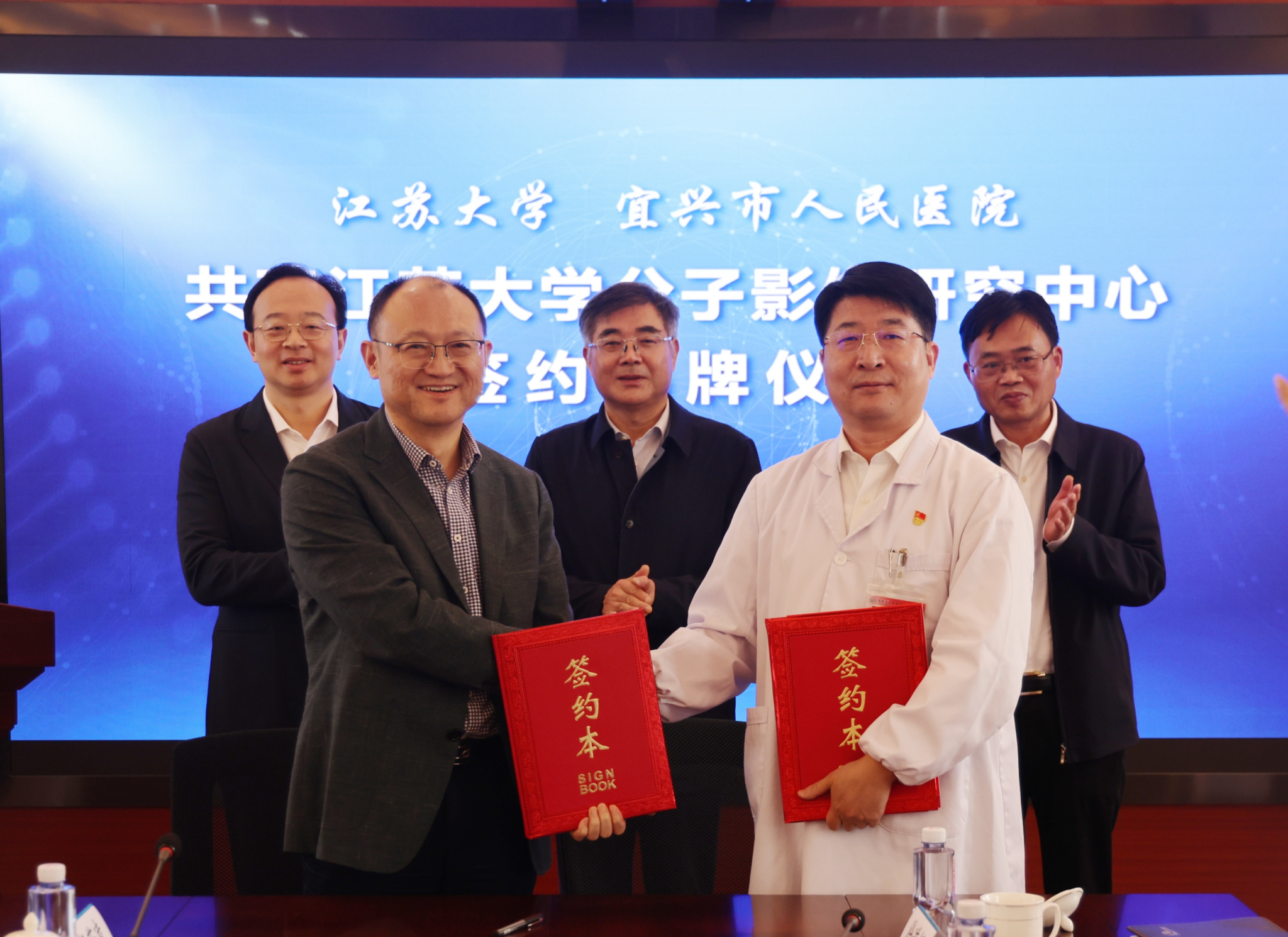 袁寿其与张毅共同为江南平台客服宜兴分子影像研究中心揭牌,张济建与附属宜兴医院党委书记曹志宏正式签署合作协议。