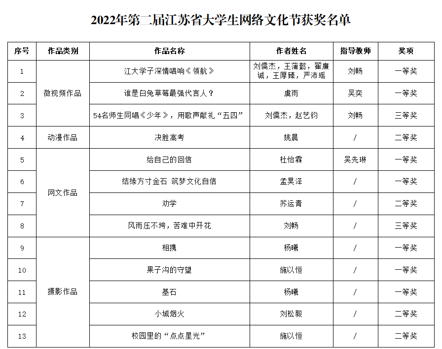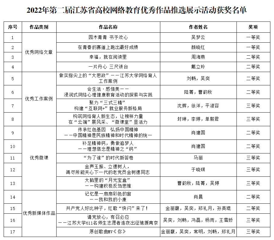 近日,江苏省教育厅公布《省委教育工委 省教育厅关于公布第二届江苏省大学生网络文化节和高校网络教育优秀作品推选展示活动遴选结果的通知》,在本届活动中,我校共38项作品获奖,36项作品进入国赛终选环节,取得新突破。