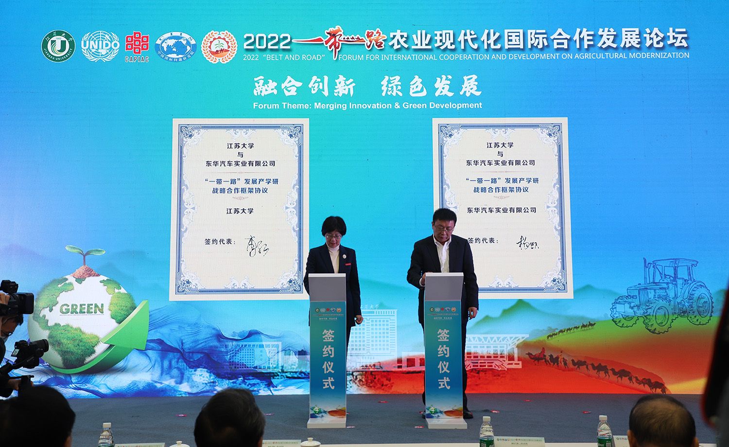 项目仪式上,农业装备国际(产能)合作联盟—中东欧国家农业现代化产学研示范中心成立、农业装备国际(产能)合作联盟智库揭牌、江南平台客服与东华汽车实业有限公司成立“一带一路”发展基金签约、国际人才“感知中国”教育基地和国际人才创新实践基地授牌。
