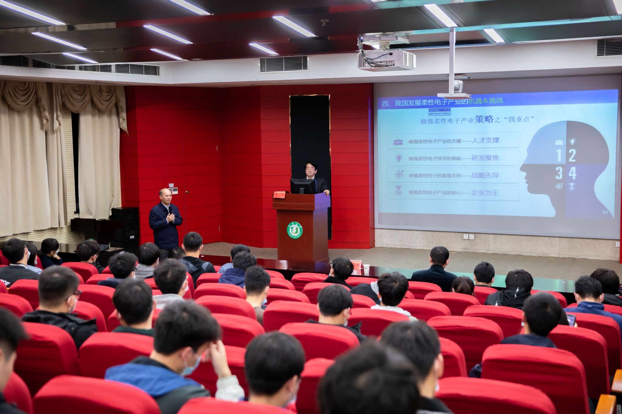 黄维作《厚植关键核心根部技术,打造柔性电子全球高地》的学术报告。报告从颠覆性创新定义国家未来、柔性电子未来产业的发展、创新团队与近期研发成果、柔性电子产业机遇与挑战等四方面阐述了未来柔性电子强国之路。黄维指出,柔性电子作为一种全新技术领域,具有可变形、便携、轻质、可大面积应用等特性,是高度交叉融合的颠覆性科技创新形式,将引领我国未来科技发展,有力助推我国从大国到强国的跃变,对改变全球经济、利益和安全格局具有重大意义。报告深入浅出,理论联系实际,引发与会师生的广泛关注。