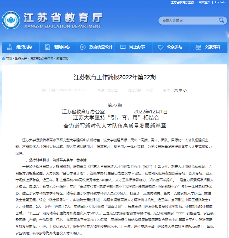 12月8日,江苏省教育厅《江苏教育工作简报》(2022年第22期)以《江南平台客服坚持“引、育、用”相结合 奋力谱写新时代人才队伍高质量发展新篇章》为题,从坚持战略引才,筑好群英荟萃“蓄水池”;坚持精准育才,厚植全面成长“好沃土”;坚持科学用才,彰显才尽其用“大作为”三个方面,专题报道了我校人才工作的思路、举措与成效。