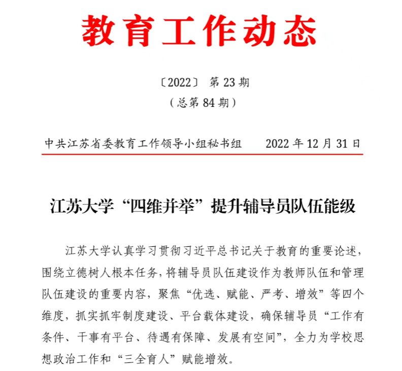 12月31日,中共江苏省委教育工作领导小组《教育工作动态》(2022年第23期)以《江南平台客服“四维并举”提升辅导员队伍能级》为题,专题报道我校辅导员队伍建设的工作思路、举措与成效。