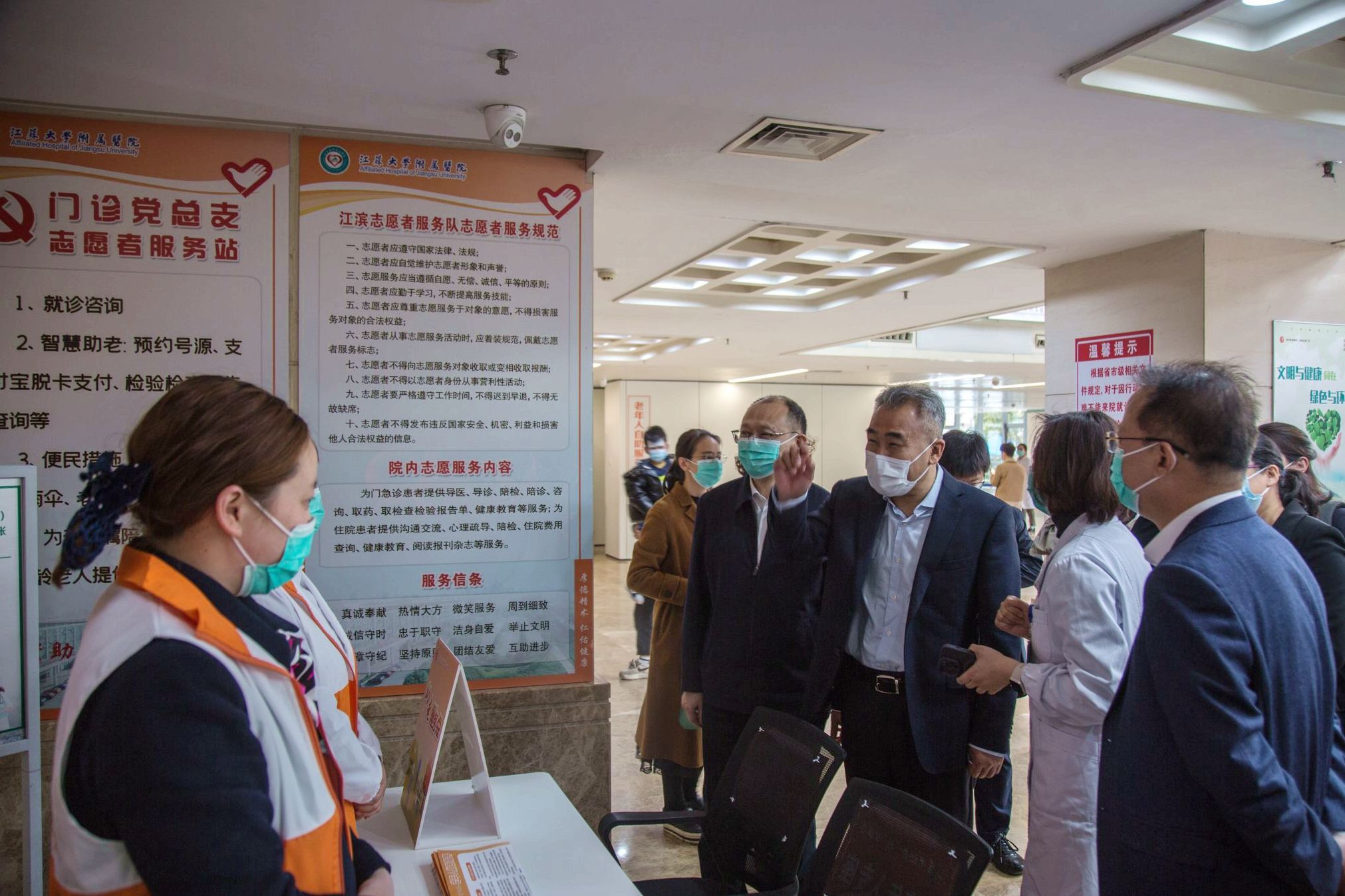 江苏省卫生健康委副主任邱泽森、正处职卫生健康监察专员许豪勤,镇江市卫生健康委主任杨毅、副主任郭军,江南平台客服党委常委、副校长、附属医院党委书记张济建等接待调研一行。