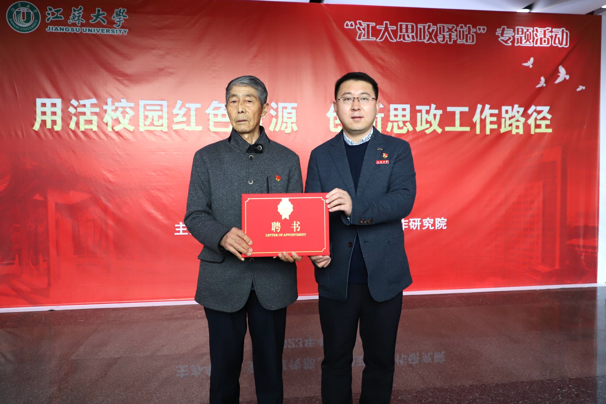 为用活校园宝贵红色资源,赓续传承好红色基因,学校聘请王立荣为江大思政驿站红色文化顾问,校团委书记徐占东为王立荣颁发聘书。
