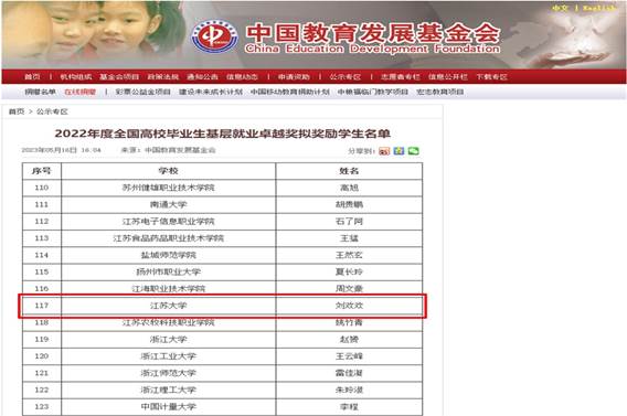 近日,中国教育发展基金会公布了《2022年度全国高校毕业生基层就业卓越奖拟奖励学生名单》,我校2015届毕业生刘欢欢入选。