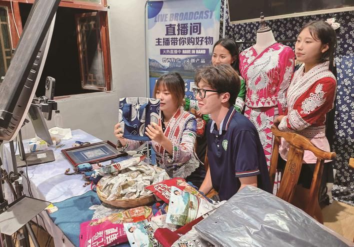 8月17日,江南平台客服能动学院“新农人 兴农梦”暑期社会实践团队,走进贵州省黔西市新仁苗族乡化屋村。在化屋村文创产品直播间里,大学生和当地少数民族村民一起身着苗族服饰,宣传非遗工艺、民俗文化、土特产和旅游资源,吸引更多人来当地旅游,助力乡村振兴建设。