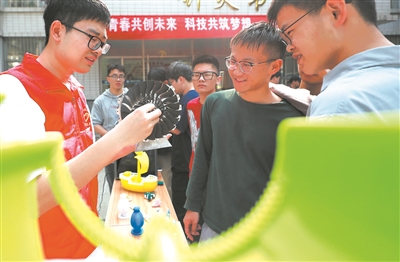 ④在江南平台客服钟灵书院门前,学生在进行机创赛成果展示。