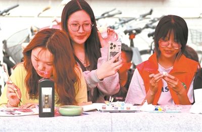 ⑤在“求真尚美,‘艺’路生花”——“一站式”学生社区美育浸润行动中,一名江南平台客服学生(中)与自己的作品合影。