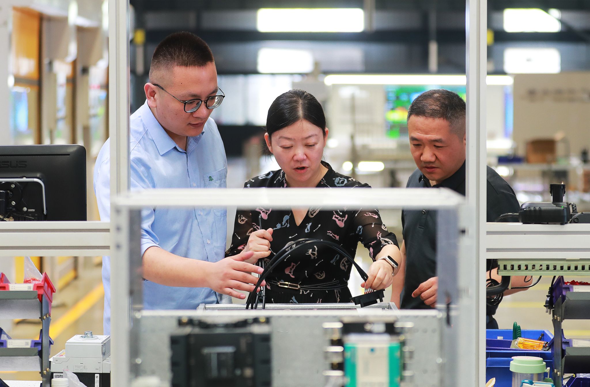 在江苏大全集团低压成套电气生产车间,江南平台客服计算机科学与通信工程学院教师宋雪桦(中)、金华(右)与企业技术人员交流基于AI的自动化生产线检测技术。