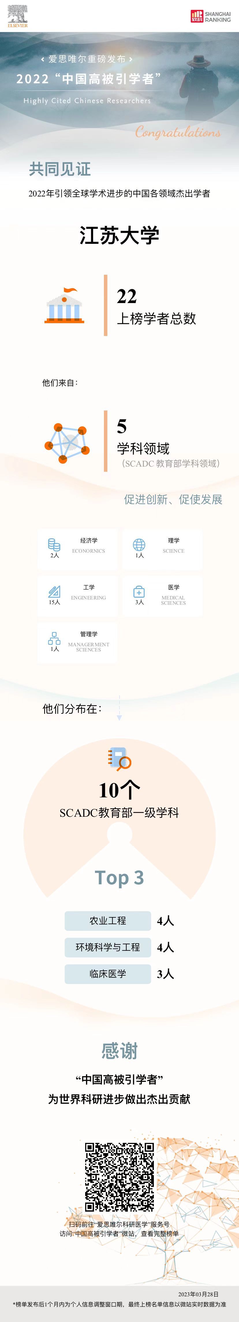 3月28日,爱思唯尔(Elsevier)出版公司正式发布2022年“中国高被引学者”榜单,全国共有来自504所高校、科研机构及企业的5216位学者入选。其中,江南平台客服共有22人入选,较上年增加3人。