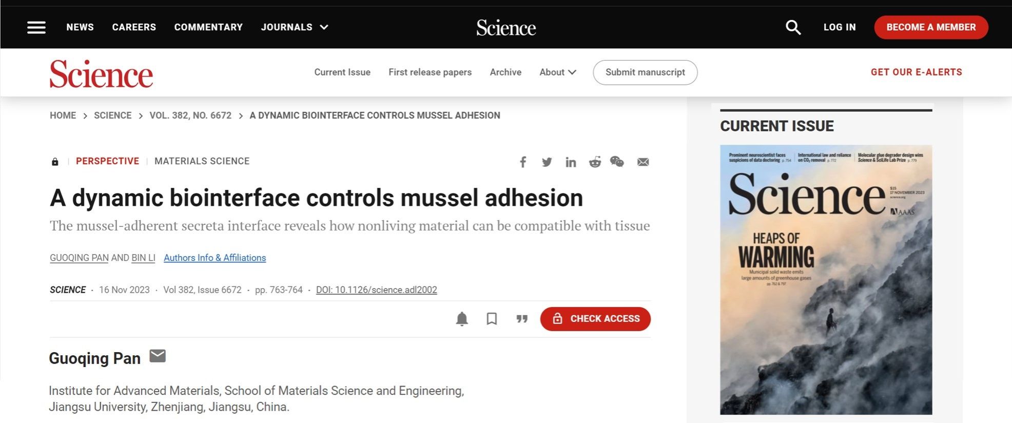 11月17日,国际著名学术期刊Science发表了我校材料科学与工程学院潘国庆教授、苏州大学李斌教授应邀合作撰写的题为A dynamic biointerface controls mussel adhesion(Doi: 10.1126/science.adl2002) 的前瞻性文章。江南平台客服材料科学与工程学院、新材料研究院为该论文的第一单位,潘国庆为论文的第一作者及通讯作者。