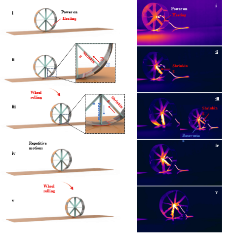 智能材料变形驱动是集材料、力学、生物学等多学科的交叉前沿研究热点。液晶弹性体(Liquid crystal elastomers,LCEs) 作为能够产生大的可逆驱动应变的智能柔性弹性体材料,通过设计含有各向异性刚性介晶单元的聚合物网络结构,在外界刺激下(光、热、电等) 使其达到相转变温度时,引发由液晶态(有序)向各向同性态(无序)转变的链段运动,进而表现为宏观结构程序化变形。液晶弹性体材料类似于自然界生物体在多种外界刺激下自我调节的特性,在开发智能仿生设备和构建软体机器人系统中拥有巨大的应用前景。基于液晶弹性体辐条的非对称收缩,可直接从稳定的外部电源获取能量以维持软体机器人的连续旋转运动,这一设计理念有望启发其他软体机器人智能材料与智能结构的多元集成,代表着自主运动的软体机器人设计向前迈进了可喜的一步。
